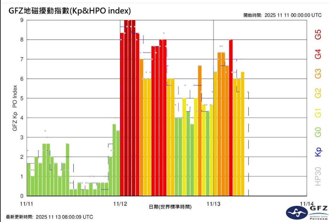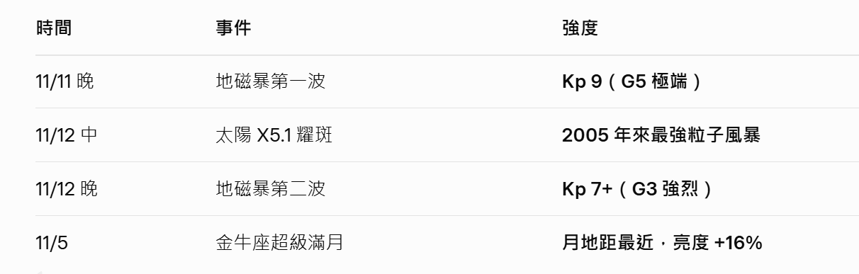 過去幾天,地球經歷了**近年最強的「雙峰 G5 地磁風暴」**(Kp 指數衝到 9!甚至更高),疊加 **11/5 金牛座超級滿月餘波**,再加上 **太陽連環 X 級耀斑**,形成「宇宙級能量三明治」。